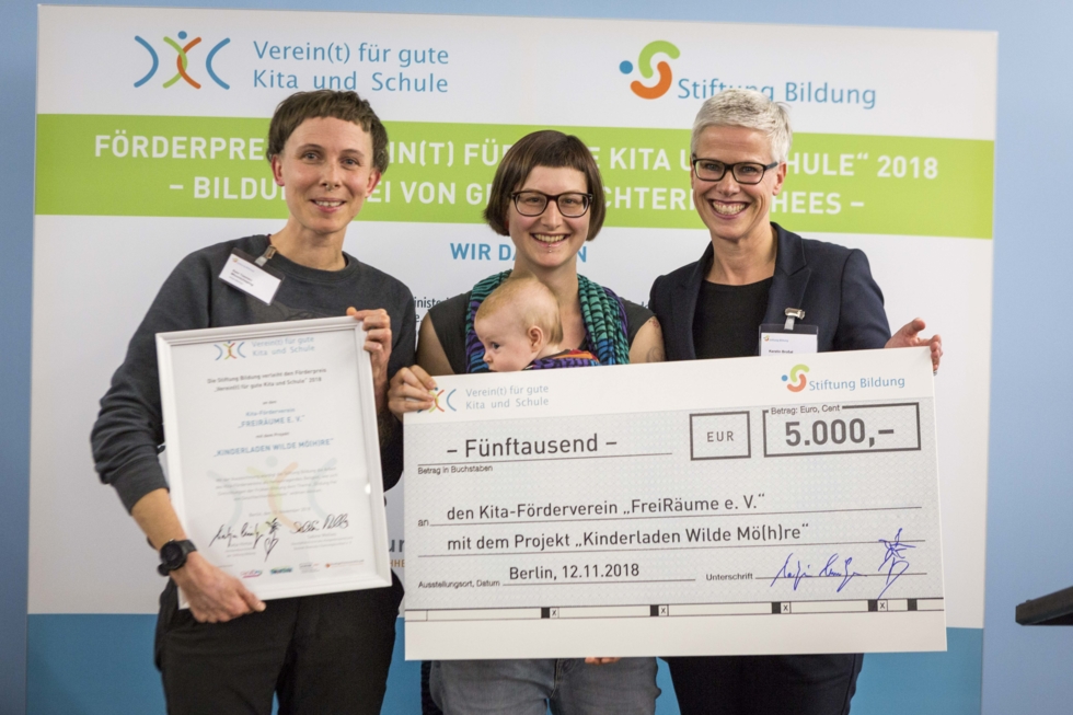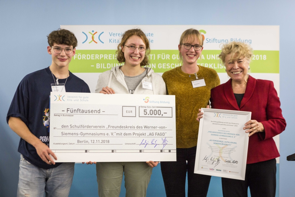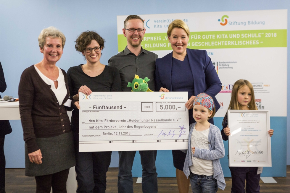 Der Förderpreis "Verein(t) für gute Kita und Schule" wurde dieses Jahr in Kooperation mit den bundesweiten Projekten Girls'Day – Mädchen-Zukunftstag, Boys'Day – Jungen-Zukunftstag, der Initiative Klischeefrei sowie dem Kompetenzzentrum Technik-Diversity-Chancengleichheit e. V. vergeben. Unter dem Motto "Bildung frei von Geschlechterklischees" setzten sich drei Kita- und Schulfördervereine aus Berlin unter 17 Nominierten aus elf Bundesländern durch. Der Preis ist mit 15.000 Euro dotiert.