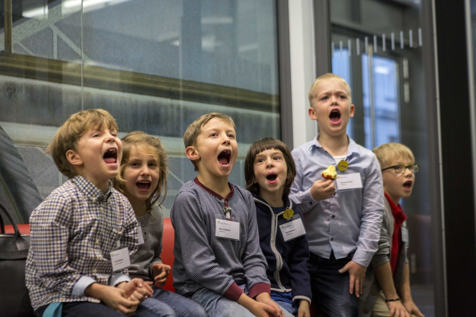 "Tim" schreien die Kinder – kurz vor der Preisverleihung bei der Fragerunde mit dem logo!-Team Jennie Sieglar und Tim Schreder